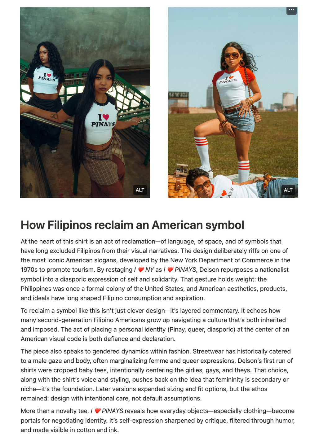 Centering femme, queer, and diasporic identities, I Heart Pinays proudly creates space for us in streetwear. This isn’t just fashion—it’s reclamation, and a reminder that being seen is power.